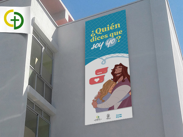 Lona de la Campaña Pastoral 2025-26 de los Colegios Diocesanos en formato vertical tamaño 100x300cm en diferentes idiomas.
